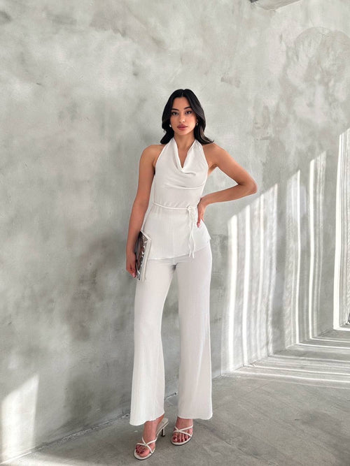 Kadın Beyaz Degaje Yaka Bluz ve Pantolon İkili Takım