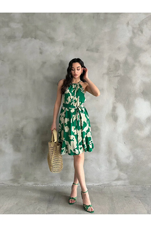 Halter Yaka Kuşaklı Diz Boyu Desenli Elbise - Yeşil
